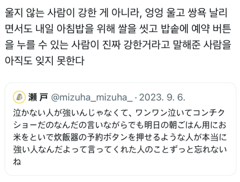 미래를 예견할 수 있는가? 아니, 없다. 지금의 상태는 괜찮은가? 아니, 괜찮지 않다. 그렇다면 무엇이 문제인가? 잘 모르겠다. 왜 문제를 찾지 못하는가? ... 말할 수 없는데 답답한 상황들을 자주 만난다. 가끔이면 스스로 위안이라도 하고 넘어갈텐데 문제는 꼬리에 꼬리를 물고 늘어진다. 스스로의 입장을 돌아다볼 겨를 없이 살아내는 것이 인간의 숙명이고 그 속에서 살아남아야 하는 인간의 생명은 꺼질 것처럼 꺼지지 않은 아련함을 타고났다. 그럼에도 불구하고, 살아내는 것은 어쩔 수 없는 선택이기도 하지만 내일을 살아내기 위한 힘을 지켜내기 위함인지도 모른다. *아래는 인스타에서 퍼온 글. 울지 않는 사람이 강한 게 아니라, 엉엉 울고 쌍욕 날리면서도 내일 아침밥을 위해 쌀을 씻고 밥솥에 예약 버튼을 누를 ..